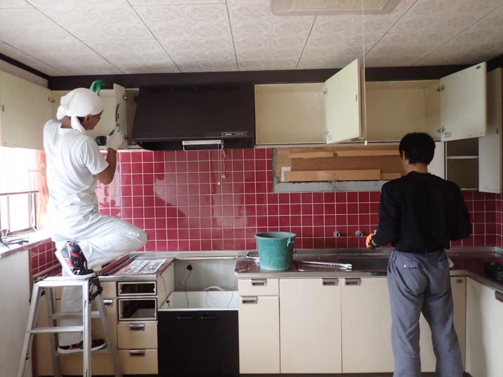 キッチンなどはリフォームする際に、仮のキッチンを別の場所に据えていく事が多いです。今回は車庫に既存のキッチン(流し台)を移動します。解体と同時に移動開始![]()