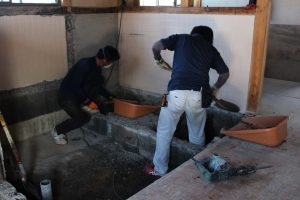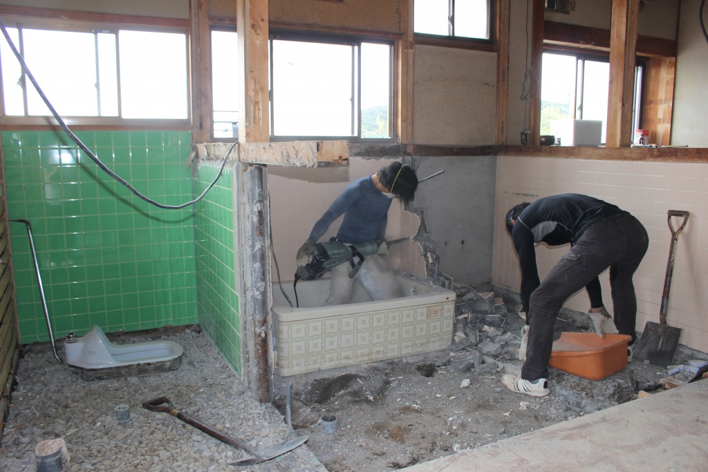 猛暑の中、コンクリブレーカーと呼ばれる機械を使い、周りの塀や宅内の水周りを解体していきます。