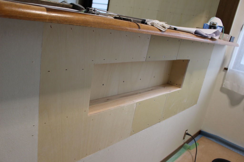 キッチンの裏側、ダイニングの方の収納棚も綺麗に仕上がって、後はクロスの張替を待つばかりです。
