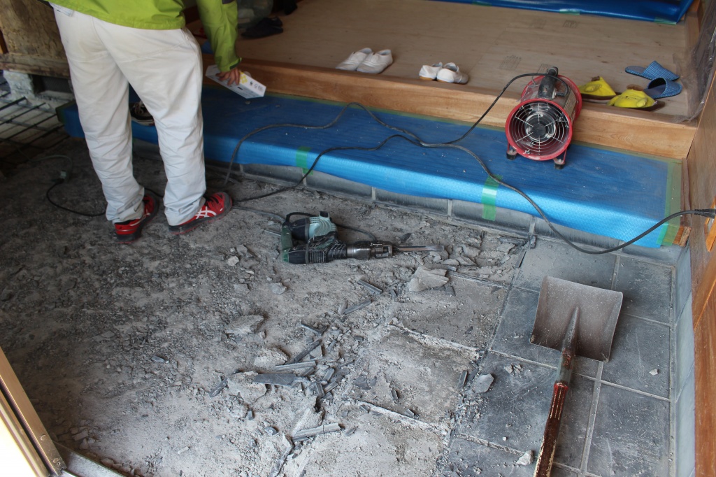 玄関タイルも新しく敷きなおすので、ハツリでひたすら剥がしていきます。