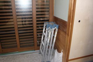 お客様用の玄関は腰板が張ってありましたが、玄関ドアの隙間から貼り込んだ雨でシミや色あせがひどい状態です。