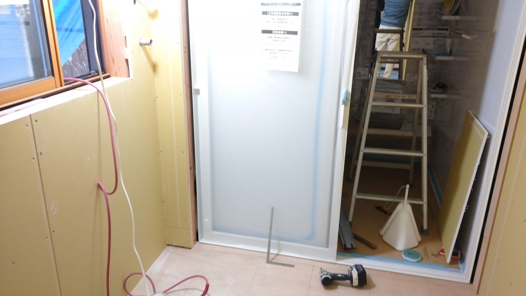 現場ではユニットバスの施工が早々と終了し、既に脱衣場の建築工事を行っていました。