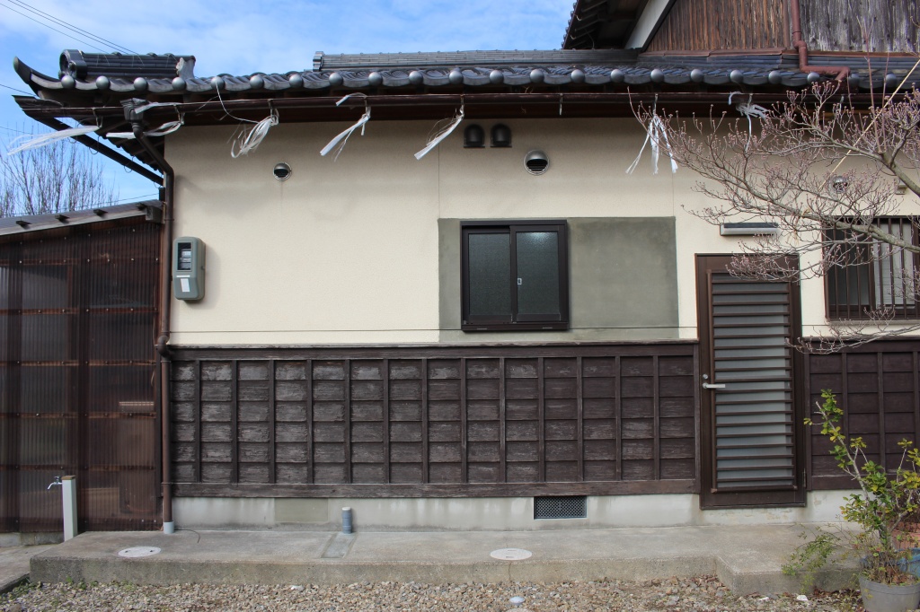 外からみると、小さくなった脱衣場の窓に合わせて壁の一部が補修されていました。