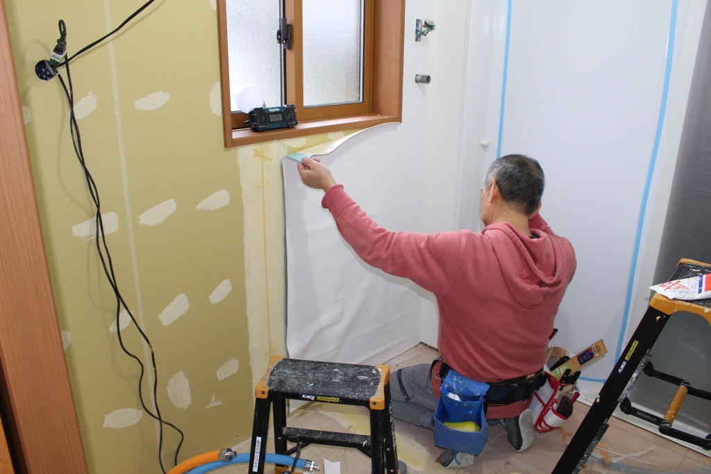 いつものようにビス山をパテで処理し、たくさんの中からお客様が選んだクロスを張っていきます。