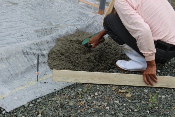 一輪車でコンクリートを運ぶのもかなりの力仕事だと思いますが、コンクリートを一人でならしてた方はずっとかがんでの作業。