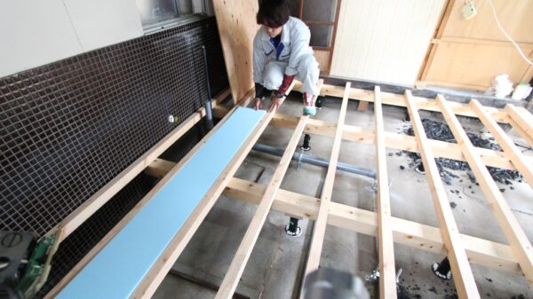 一枚の断熱材では長さが足りないので短くカットして隙間なく入れていきます。