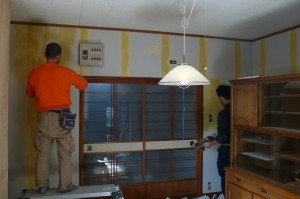 私はとても不器用なので、小さなシール1枚貼るにもなかなか上手くいかないのですが こんなに大きなクロス(幅1800ミリ)をまるで魔法の様に貼ってしまう職人さんは 本当に凄いです!! |