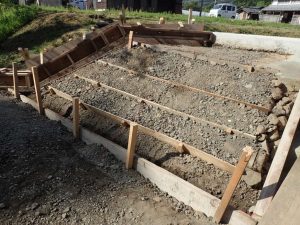 コンクリを入れるための型枠を作り入れます。側溝より少しコンクリを入れる分地面を下げています。