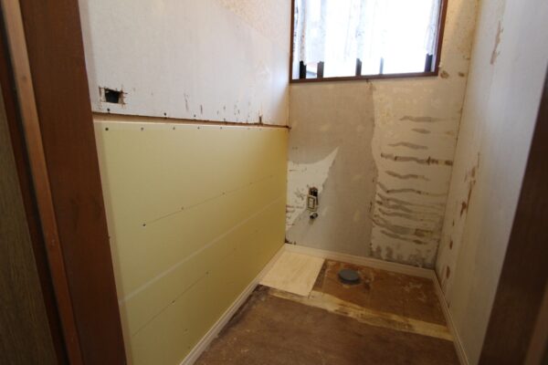 湿気が回ってこないように壁と床を張り、お施主様が『明るい印象になるようみんなで考えた』クロスとパネルで仕上げました。
